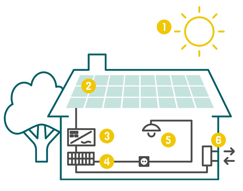 En solpanel består av flera solceller som är sammankopplade. Solcellerna omvandlar solens strålar till elektrisk energi i form av likström. - Växelriktare