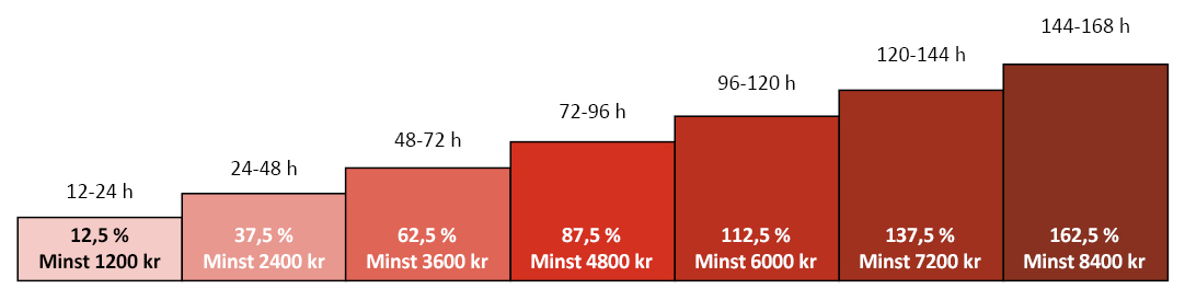 Ersättningen som betalas ut påverkas av längden på avbrottet (som lägst 12 timmar). Hur mycket ersättning du får bestäms av procentsatsen i figuren nedan, räknat på din årliga elnätskostnad. Den lägsta nivån du kan få ersättning för är 1 200 kr. Du har maximalt rätt till ersättning på 300 procent av den årliga elnätskostnaden.
